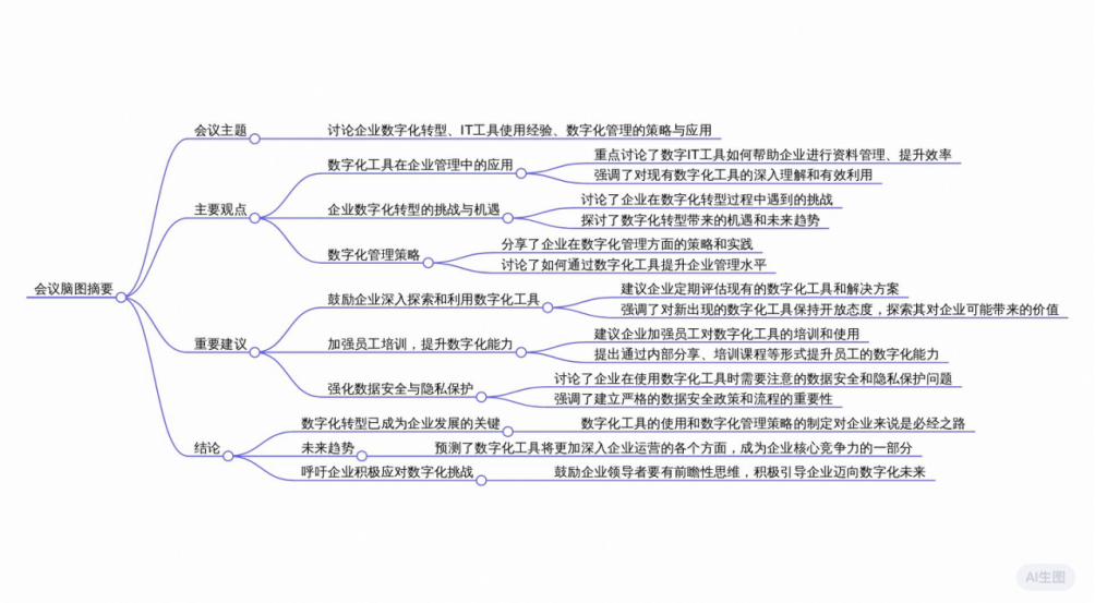 通过数字化会议内容,提取关键信息,形成关键词、摘要及速览,以支持AI服务器和企业内部知识库的构建,促进信息传递和企业发展方向的明确。这些整理不仅用于公司内部的知识分享和人力资源建设,还通过对外展示,增强了公司发展方向的透明度和客户服务质量。